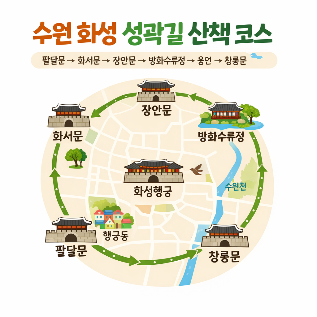 수원 화성 성곽길은 약 5.7km 정도로 이어지는 산책 코스로, 구간을 나누어 걸으면 1시간에서 2시간 정도면 충분히 둘러볼 수 있습니다.