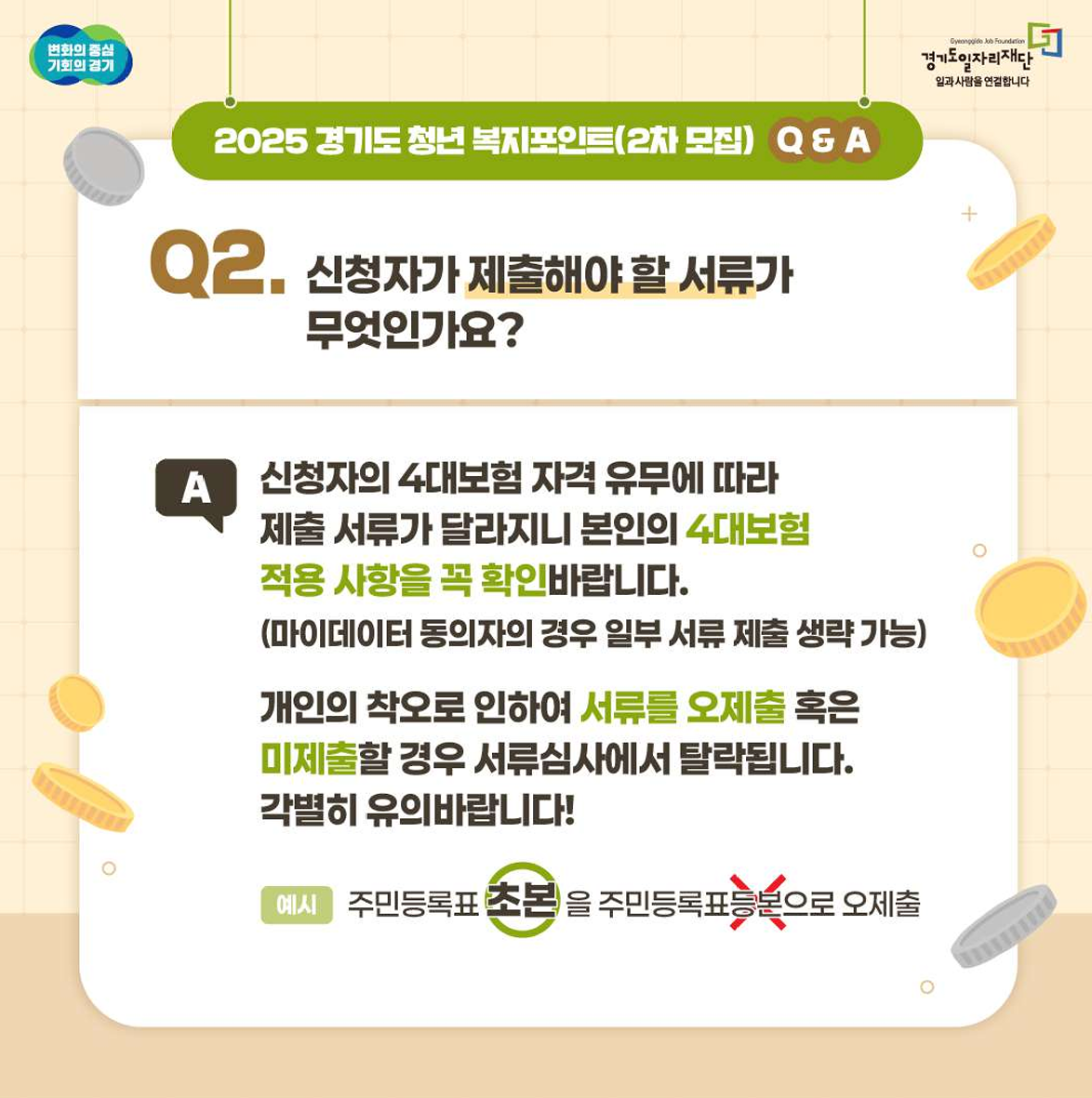 「청년 복지포인트」는 온라인 신청ㆍ접수이며, 신청자가 입력한 정보 또는 첨부파일로 업로드한 증빙자료가 부정확하거나 확인이 불가능한 경 우 또는 임의로 편집한 경우 선정에서 제외될 수 있으니 정확하게 입력 하여 주시기 바랍니다.