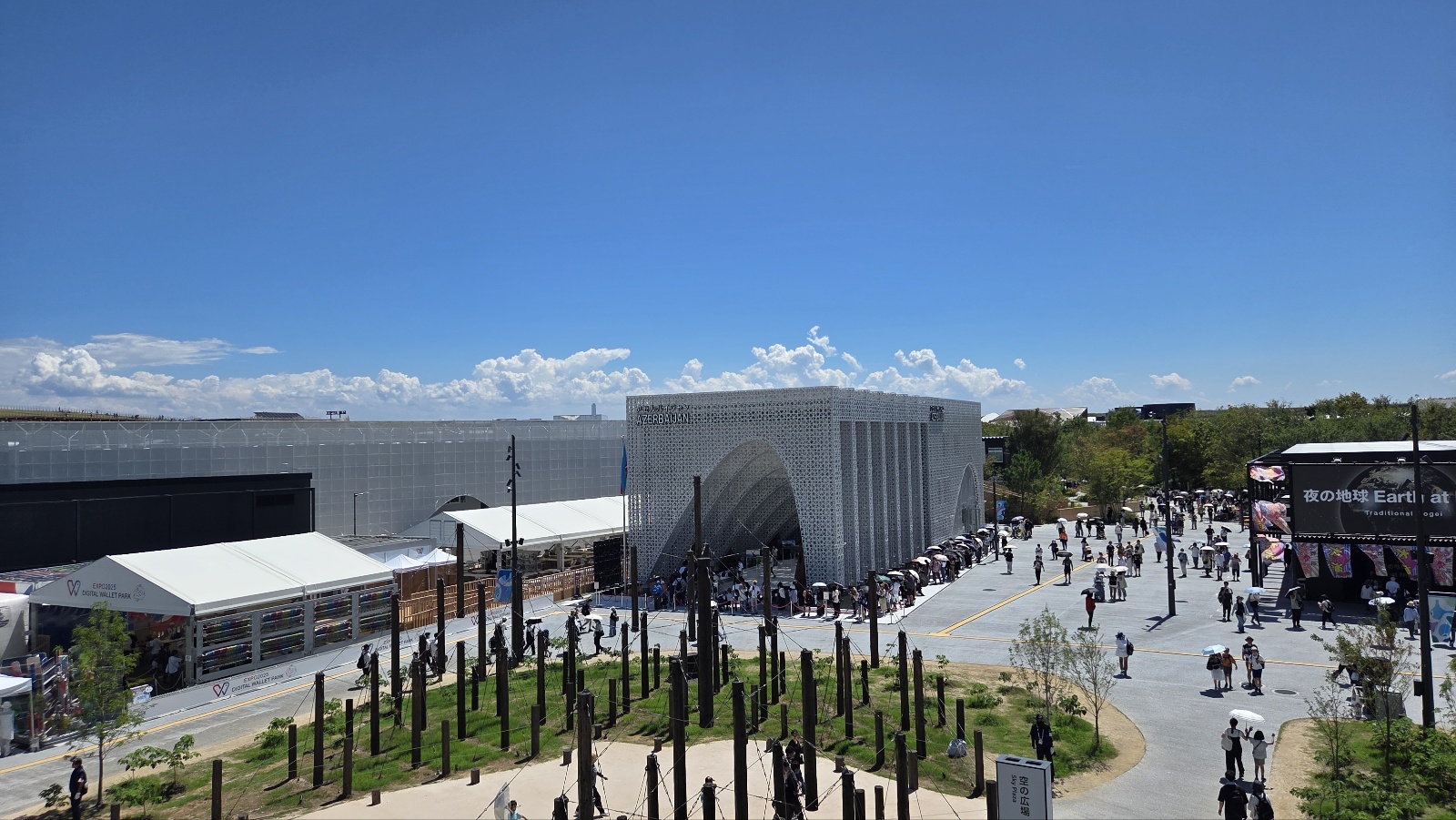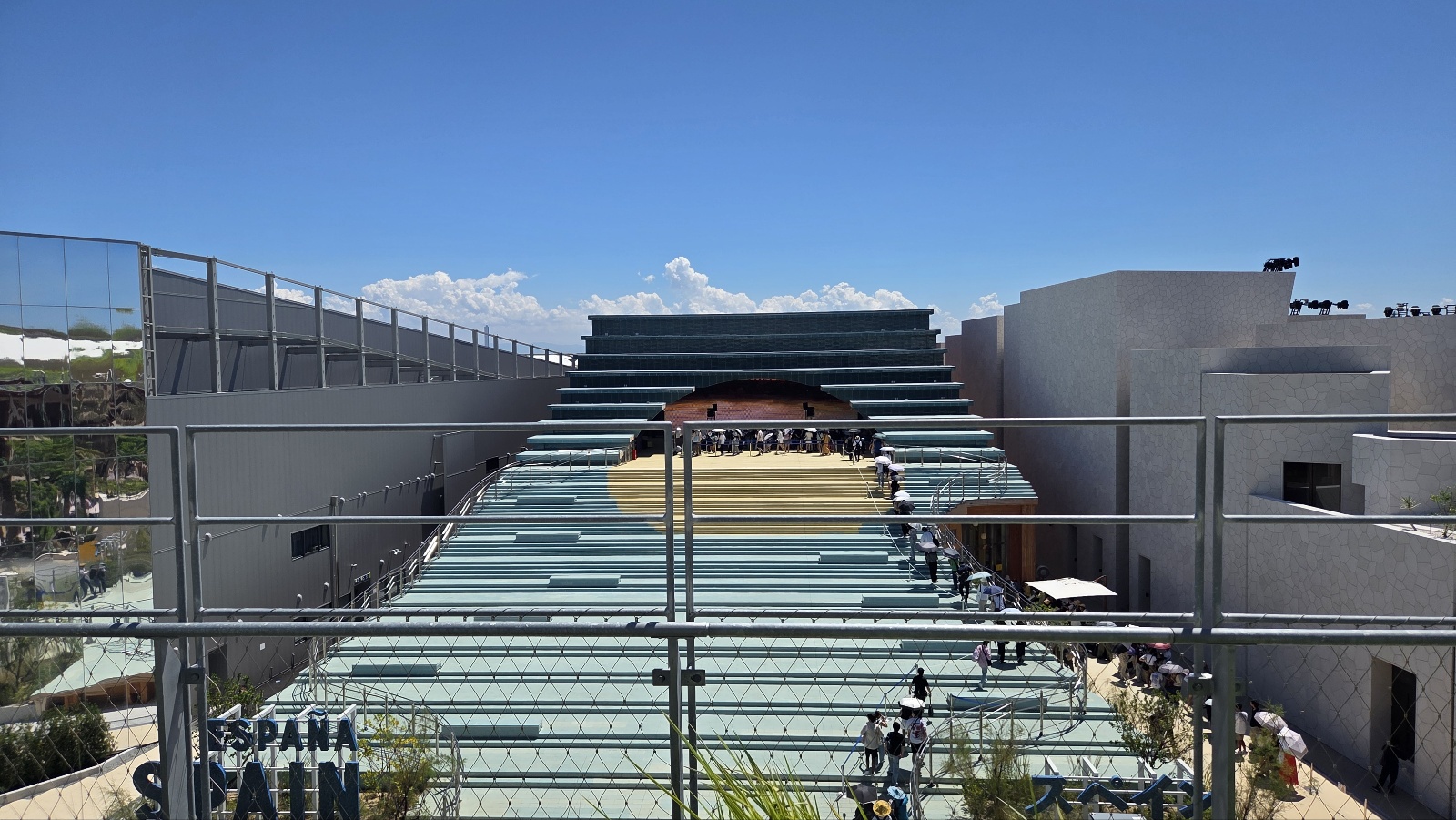 박람회의 상징인 ‘링(Ring)’은 일본 목재로 만든 초대형 원형 구조물로, 이번 엑스포의 랜드마크 역할을 하고 있었습니다. 아래는 사람들이 그늘에서 쉬는 공간으로, 위쪽은 전망대로 개방되어 있어 많은 사람들이 찾는 명소였습니다.