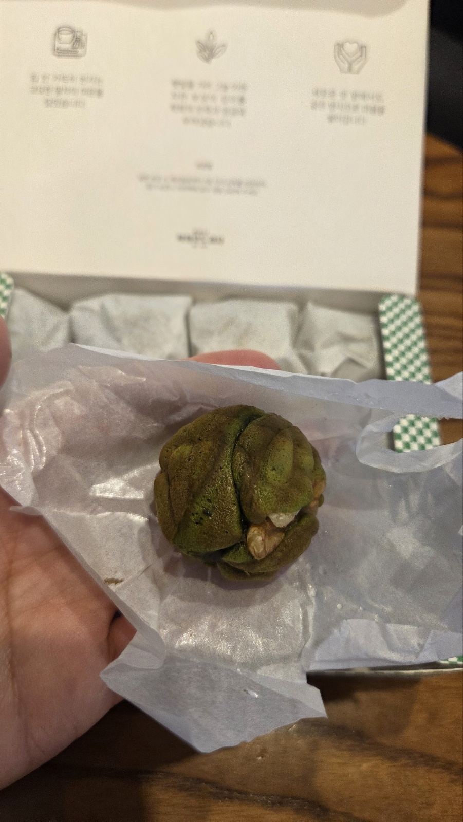 곧이어 앙금의 달콤함과 호두의 고소함이 뒤따라와요. 말차를 좋아하는 분이라면 반할 맛!