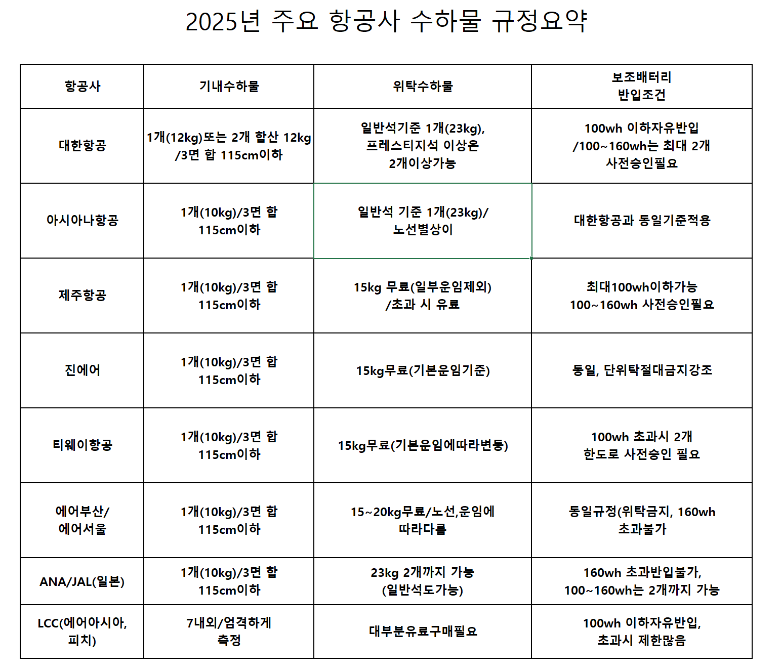 2025 항공사별 수하물 규정 요약표